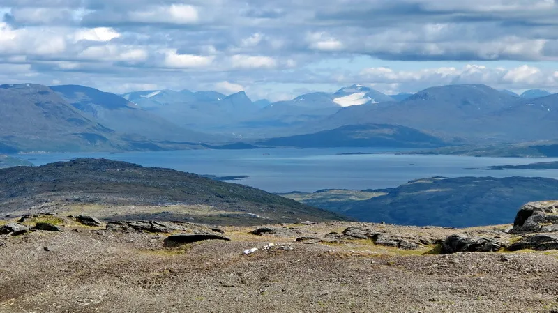 Utsikt från Furusteinsfjellet österut mot Virihaure och Sarekfjällen. Kuoper och Lanjek mitt i bild.