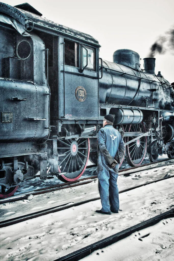 Tåget utstrålar vinterkyla men det gör inte den avspände betraktaren. För mycket photoshoppande för min smak.
