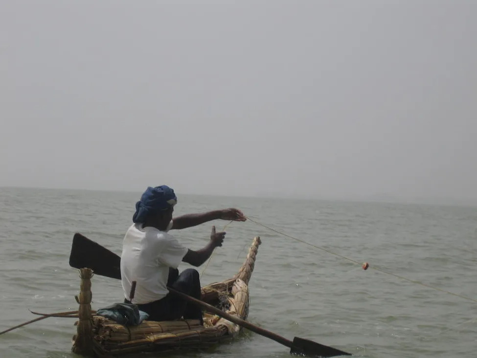 Fiskare i en traditionell kajak gjord av papyrus