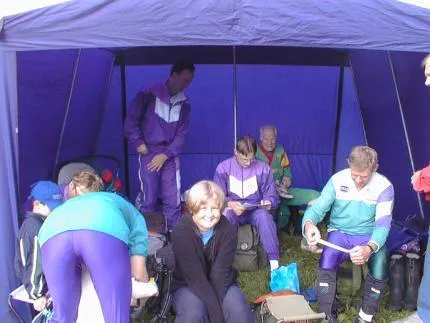 Orienterings(familje)gemenskap i Tockarps IK på tävling hösten 2000. Dottern Emily sitter i mitten, pappa bakom kameran och farfar långt inne i tältet!