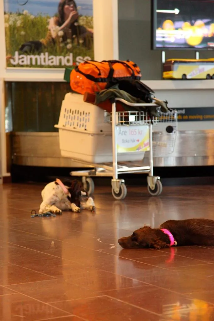 Östersunds flygplats med två nöjda hundar och väntande flygresa hem till Skåne