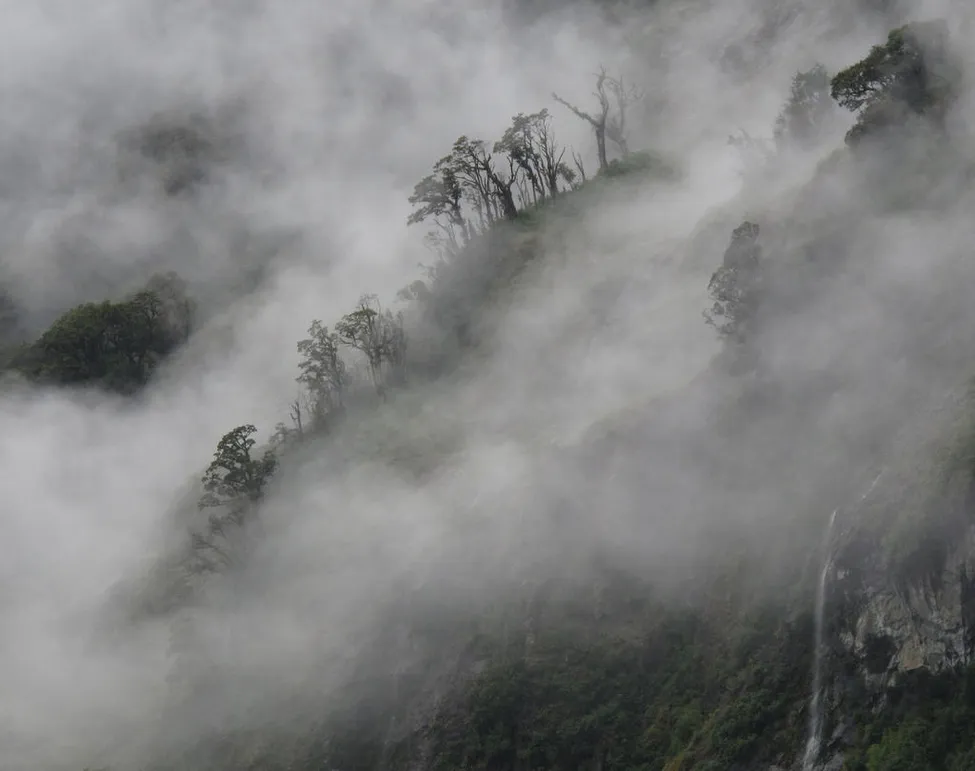 Ett försök att fånga en "trolsk" stämning där träden skymtar fram i de lågt liggande molnen vid Doubtful Sound. Träden växer på bergssidan något hundratal meter ovanför fjorden.
