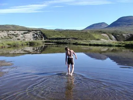 Jesper tar sig ett bad efter att ha vandrat i värmande sol.