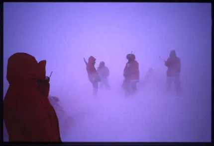 Mitt i natten smällde alla larmminorna av en efter en. Orsaken var den hårda vinden (upp till 20 m/s) och 'freezing fog', dimma som frös på larm-linorna. Eftersom vi nu inte längre hade något som varnade mot isbjörnar, så var det bara att gå ut och ta geväret med. Ola, som en gång fått sitt tält (med Ola inuti) rivet av en Isbjörn var först ut...