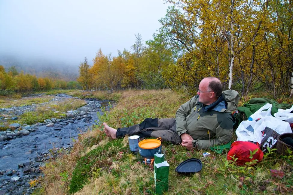 Lunch efter att ha vadat jokken från Unna Räitavagge. Vadet var väldigt enkelt då det var många fåror. Hade svårt att hitta stigen sedan och vi fann den inte förrän strax före hängron över Vistasjokka.