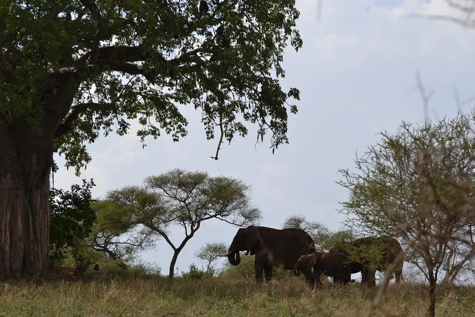 Elefantfamilj och babianer under Baobabträd i Tarangire NP