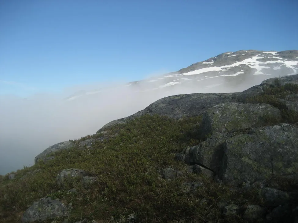 Molnen hade sjunkit en del på morgonen och låg som en dimma över sjön.