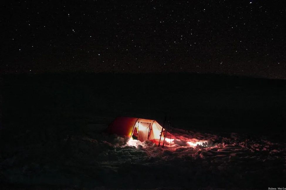 Efter en lång dag på fjället, med motvind och snöskurar, var det skönt att komma hem till tältet i ravinen, och lagom till tandborstningen så sprack himlen upp och bjöd på denna föreställningen.