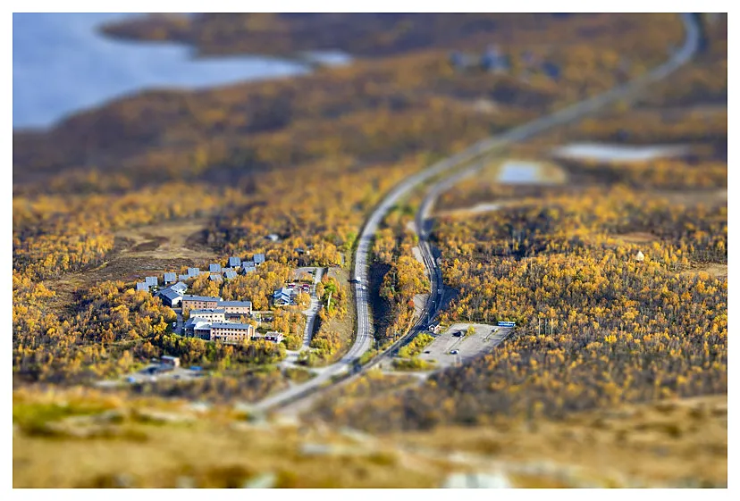Tackar för kommentarerna, det är ingen Märklinbana utan bilden är tagen från panorama cafet på berget Nuolja i Abisko. Jag önskar att jag kunde säga att jag använt ett tilt/shift-objektiv men tyvärr har jag inget sådant. Däremot har jag försökt skapa känslan av ett sådant i Photoshop och för att få Märklinkänslan så skruvade jag även lite på färgmättnad och kontrast.