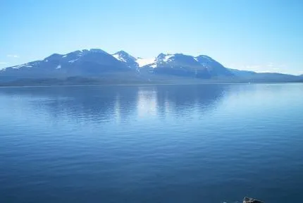 Utsikt från hamnen i Ritsem över Akkajaur och Akka.massivet