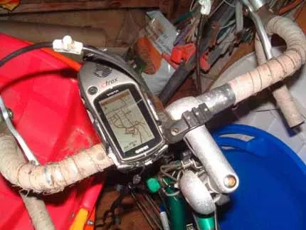 Egentillverkat cykelfäste för Garmin eTrex GPS. Gjort av en aluminiumplåt, som jag sågat och bockat efter behov.