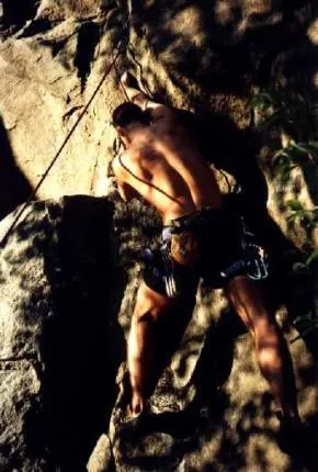 Mikael Andersson klättrar Karrakdrakk 6+ (eller nåt) på Åberget, Boden.