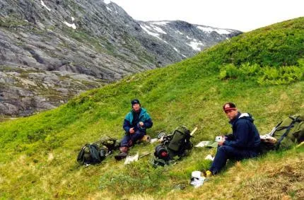 Vandring med Kenneth och Pelle i Börgefjäll, Norge. Efterlänktad lunchpaus under en intressant ;-) men kylslagen och regnig fjällvandring