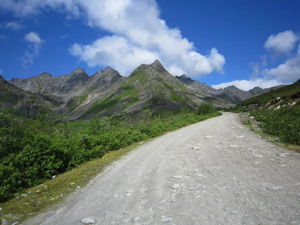 Följer vägen som ska ta mig till dalarna i Hatcher Pass.