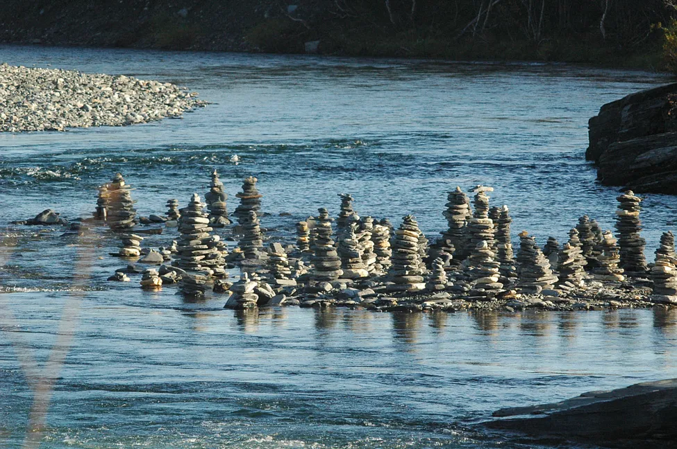 På hösten minskar flödet i jokken och vattennivå sjunker, därmed blir grunda partier i flodfåran torrlagda och promenadvänliga. Turister passar då på att bygga monument (rösen) av byggvänliga, flata stenar, kreativitet utan skadeverkningar!