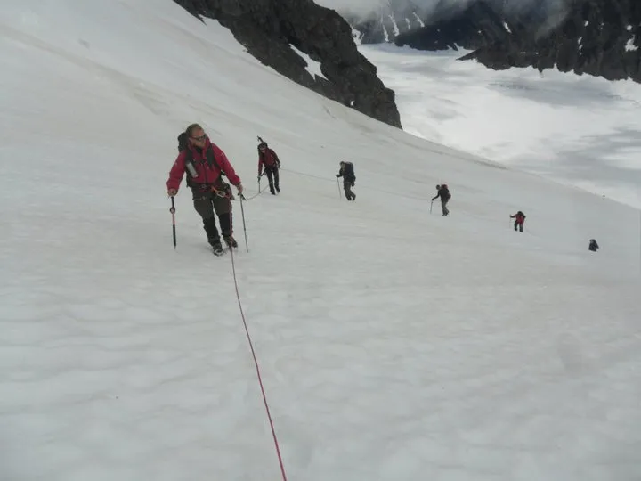 Det börjar bli lite brant på Storglaciären. Mot Sydtoppen över Storglaciären, Björlings glaciär och Via ferrata-leden.