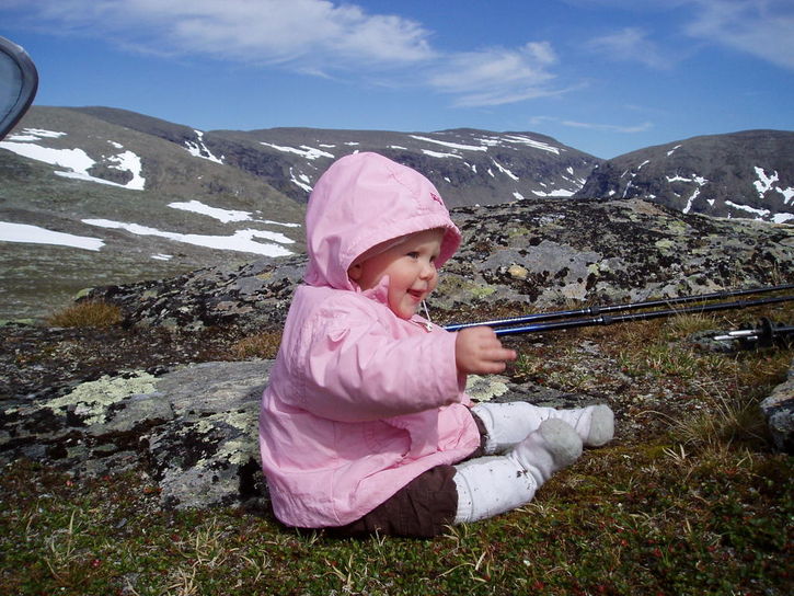 Jag och vår 1-åriga dotter förenas i en stunds lycka av att vara på fjället i vackert väder. Är vi lyckliga av samma anledning? Kanske inte men det spelar mindre roll. Men det verkar faktiskt som att hon, liksom jag, trivs bland fjäll. Eller är det bara mitt eget önsketänkande som lurar mig? :-)