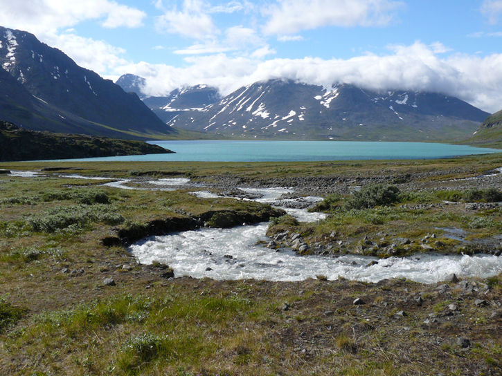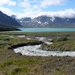 Bierikjávrre, norrifrån. Glaciärvatten löpar ned i den vackert färgade sjö