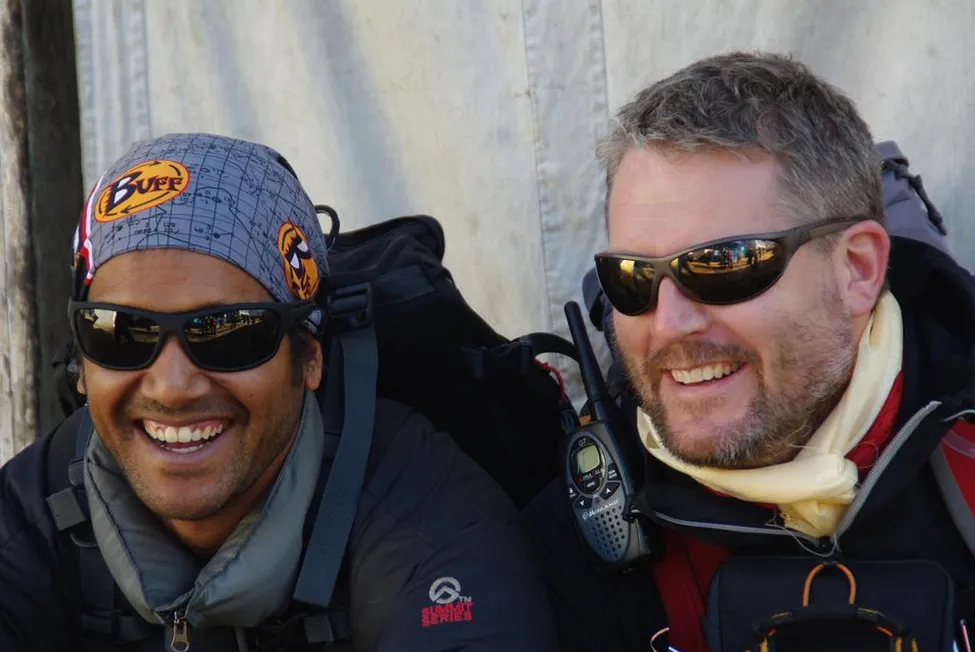 Fredrik Hermelin med Sirdar Ram Silwal på väg till Namche Bazaar i Nepal.