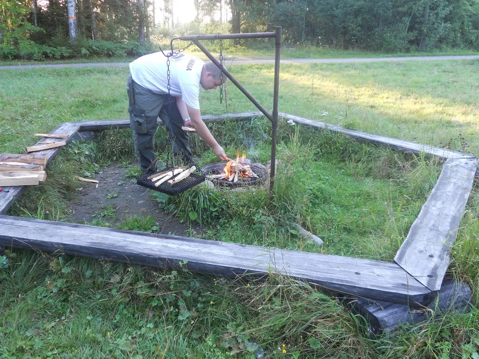 Fuktigt efter regnet. Allting var blött. Brasa för torkning och moralen.