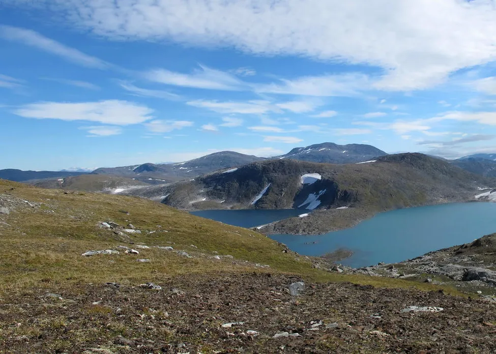 Messingtoppen, östra delen. Vy mot sydost. Östra Messingmalmvatnan, Leirvassfjellet, Ålmajalostjåkkå i bakgrunden