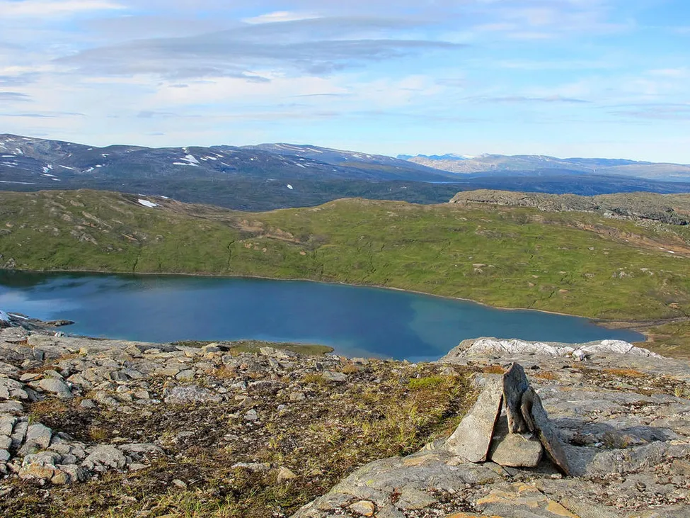 Tillbaka på fjällryggen NV riksröse 240C. Tack vare de små rösen jag satte upp hittar jag den enda vägen ner mot sjön 831. Rundar sjön på höger sida och skråar upp till lägsta punkten på ryggen mitt i bild.