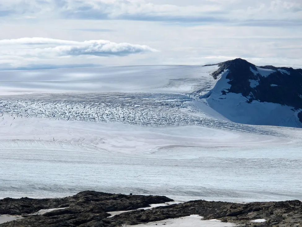 På Messingtoppen, västra delen. Blåmansisen. Stort sprickområde där ismassorna vrider sig runt toppen 1392.