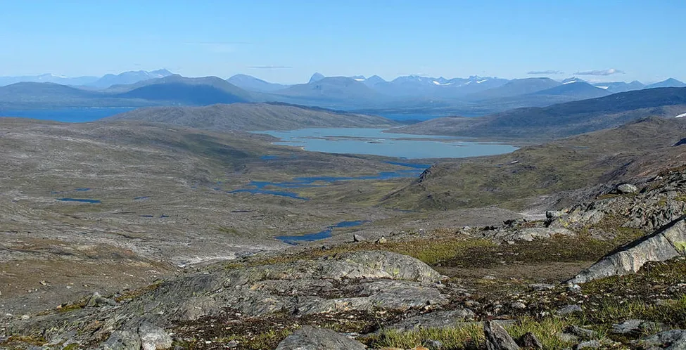 Messintoppen, östra delen. Vy mot ost-nordost. Vattendraget som rinner ut i den slamfyllda sjön Gasakjávrre, som också fylls på från Leirvatnet och Blåmansisvatnet genom Skagmadalen. Blåmanisen är ett av Stora Luleälvs största källflöden. Längre bort skymtar Virihaure och till vänster Vastenjaure samt Sarekfjällen i bakgrunden. Niak mitt i bild.
