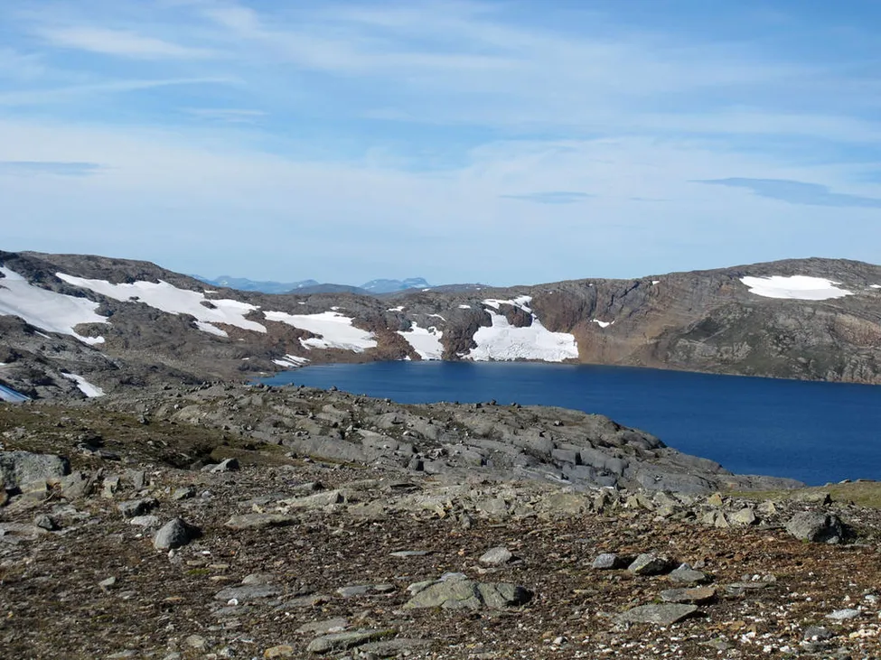 Mellan Kvitvatnet och riksröse 240C. I slutet av den fina slätten blir terrängen återigen stenigare när jag närmar mej Messingtoppen. Vy västerut över Kvitvatnets sydvästra strand med några små glaciärer.