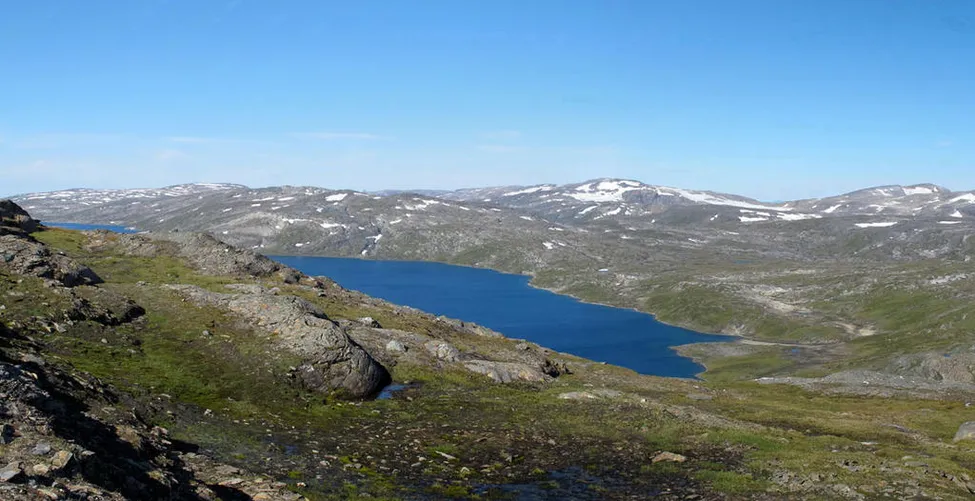 Från platån norr om höjden 1086 NV riksröse 240C. Vy nordväst mot Nedre Veiskivatnet. Goadasjoajvve, Flatkjölen och Litl Rago i bakgrunden till höger. När jag kommit upp över krönet till denna platå visar det sej vara rätt mycket gräs och mossa mellan klipporna, så det är ganska lättgånget här, bättre än jag befarade.