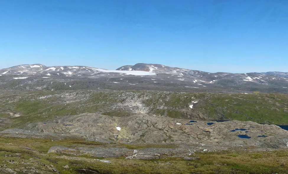Från platån norr om höjden 1086 NV riksröse 240C. Vy norrut mot Ragotjåhkkå och Ragojiekna. I högerkanten syns riksröse 240D, gul rektangel inritad.