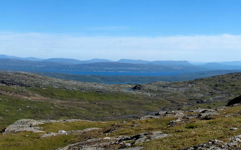 Från platån norr om höjden 1086 NV riksröse 240C. Vy nordost. Långt borta syns de vita klipporna på Vastenjaures norra strand.