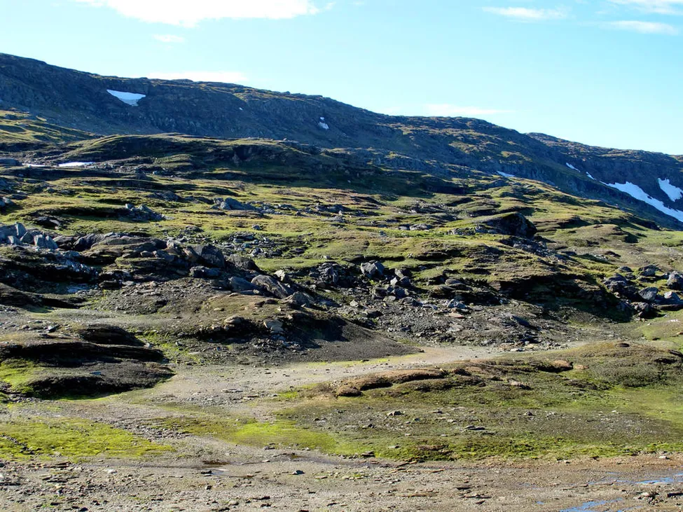 Efter sjön 831 skall jag upp på en tvåhundra meter hög fjällrygg. Det är branta klippor, men jag tycker mej kunna se en liten öppning där man borde kunna gå.