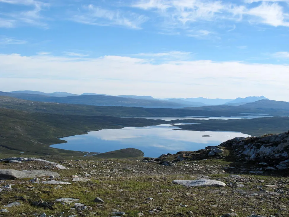 Innan jag kommit upp på Boajmasj ser jag ut över ett spegelblankt Raddujavrre.
