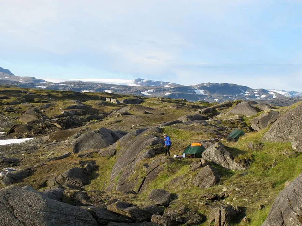 Tidig morgon. Vi (Rune Magnusson och jag) skall denna dag göra var sin dagstur. Rune skall leta kalk och ev. grottor i området, jag skall göra en tur mot Blåmansisen som syns i bakgrunden.
