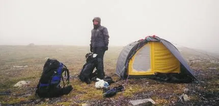 Anna utanför tältet vid foten av Sylarna. Det var +9 grader kallt, dimma och småregn. Lyktan värmde och torkade tältet i alla fall.