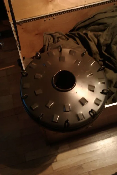 dellen som håller upp dutekn på ett militärtält i hålet går kaminens rör sen spenner man tält duken runt hella diskusen eller vad den nu heter, kommer ladda upp en beskrivning snart