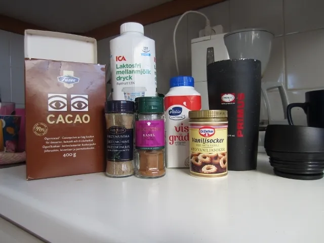 Häll lite vispgrädda i termosen. 4 tsk kakaopulver, 1 tsk vaniljsocker. Krydda med kardemumma och kanel efter egen smak. Koka upp mjölk, häll i termosen och blanda.