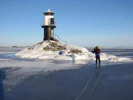 Fredrik kollar in isen innan landstigning på Fjärdhällan i Jungfrufjärden
