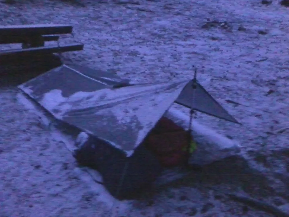 Var och testade Sea to Summit Ultra-Sil Tarp-Poncho som jag ska ha på en 9 till 10 dagars vandring om 1 1/2 vecka. Och det blev ett bra test med både blåst och snö, lite synd att det inte kunde regna också, men allt går inte att få på en natt. Sov otroligt bra och helt utan kondens, bara lite snö som hade blåst in på ena sidan. Både jag och sovsäcken var helt torr.