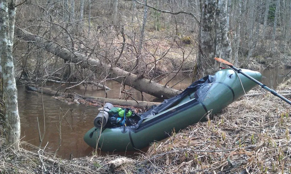 Det finns gott om fällda träd som dessa längsmed älven. Med en packraft på dryga 2 kg är det dock inga problem att lyfta sig förbi.