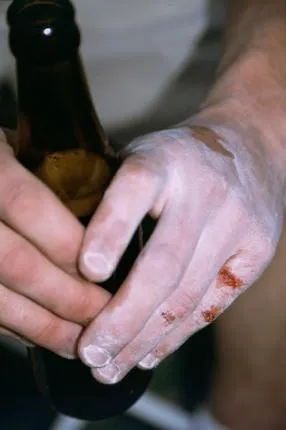 Matt fastnade med fingret när han bouldrade. Chamonix 2001.