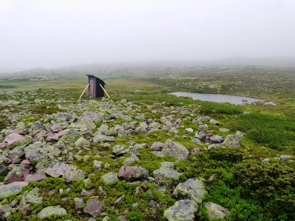 Utedass vid Tangsjöstugan blåstes omkull av någon storm och lagades provisoriskt.