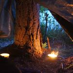 Sovplats av pressenning. marschaller för skydd mot mygg. Tillverkade av stearinblandning, kåda och fnösksvamp.