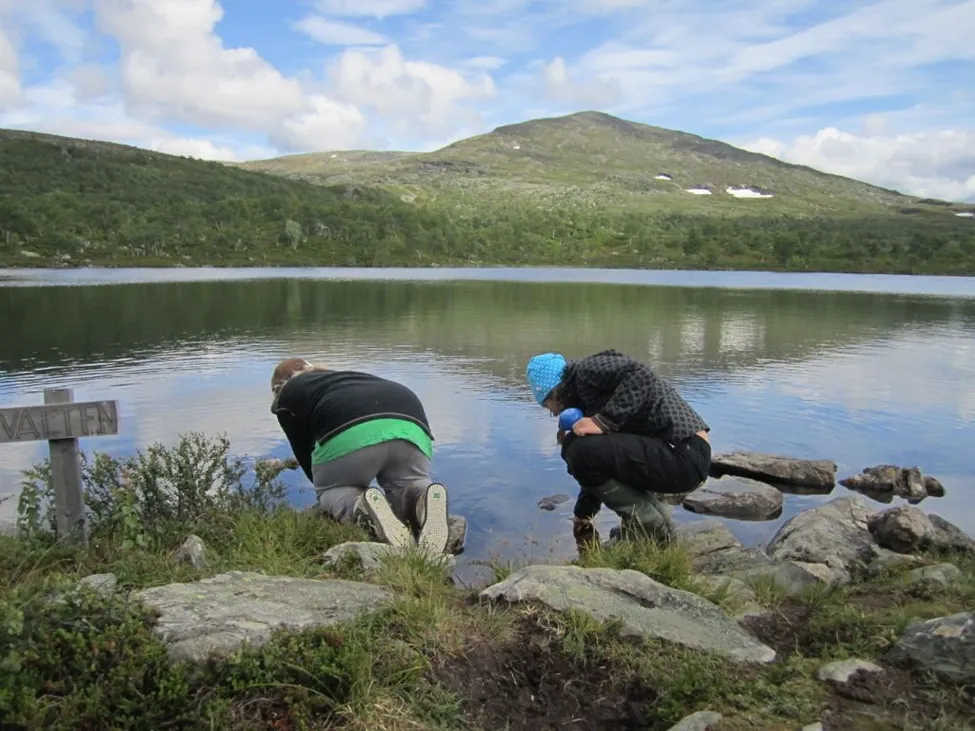 Cissi och Robin letar grodyngel i tjärnen vid Lunndörrsstugan