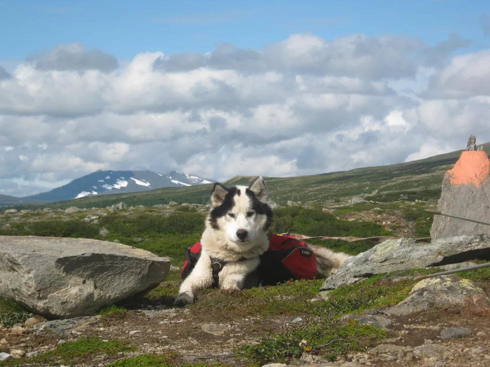 Grönlands hunden Aizing på tur i Jämtlandsfjällen ! Tar en vilopaus efter att vi vadat över Gåsen.