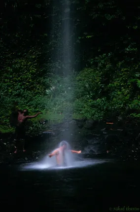 Per och vår guide duschar under ett vattenfall på Dominica.