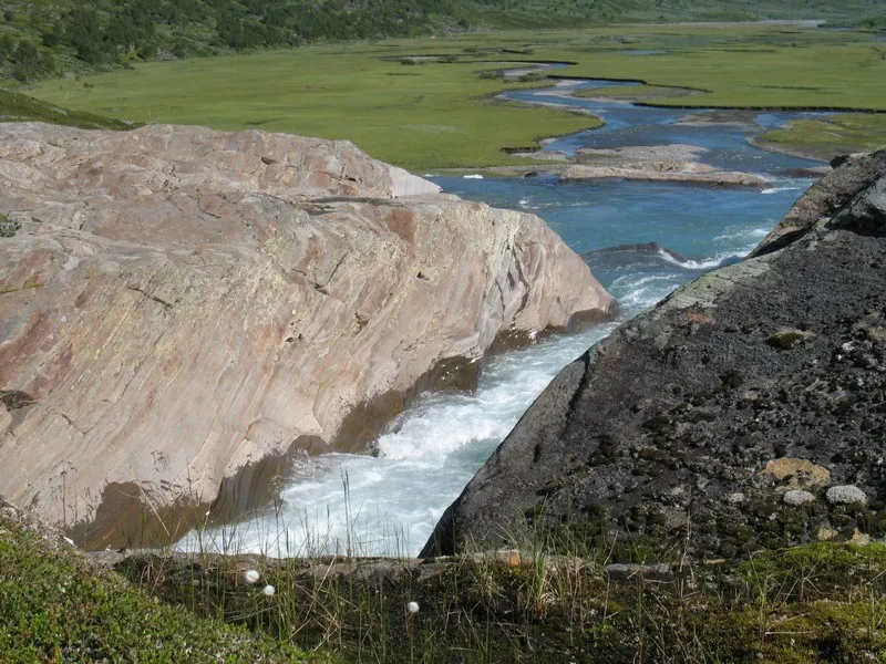 Kuoperjåkk vattenfall och delta. Lättvadat i grunt vatten på grusbädd.
