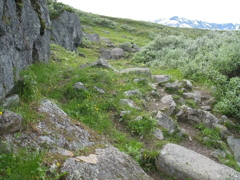 Renstigar är vandrarens bästa vän. Här en passage där alla stigarna trängts ihop mellan klippan och videt. Behövde aldrig tränga fram i ospårat vide.