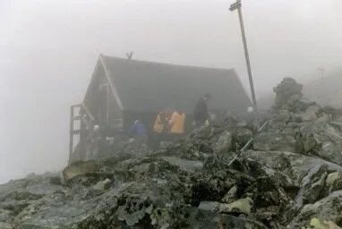 Toppbestigning via Östra leden på Kebnekaise med guider. På vägen åter från Kebnekaises sydtopp rastade vi vid toppstugan för att få energi inför nedfärden.